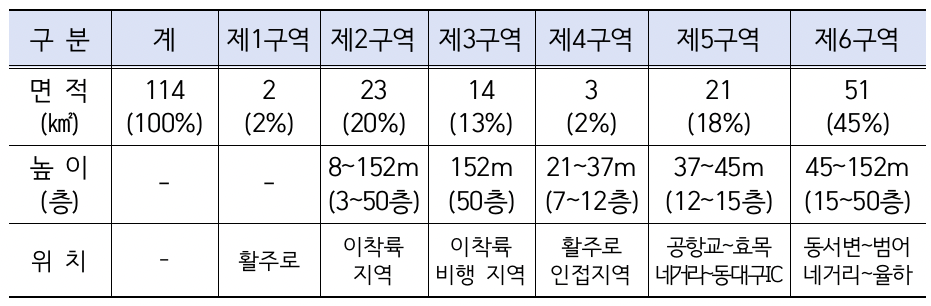 특히 15층 이하로 층수 규제를 받고 있는 지역은 약 6만여 세대가 거주하는 약 30㎢이며, 이 중 제2구역 일부지역과 제4구역, 제5구역의 층수제한 없는 제2종일반주거지역, 제3종일반주거지역, 준주거지역, 상업지역의 면적은 약 6㎢이다.