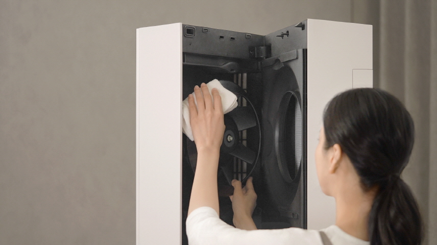 기존 에어컨은 스무 개 정도의 나사를 분해해야 패널을 오픈할 수 있어 복잡하고 불편했다. 신제품은 스크류 1개만 풀고 버튼을 누르면 제품이 열리도록 간소화했다. 고객은 제품을 연 뒤 내부 팬을 청소하면 된다.