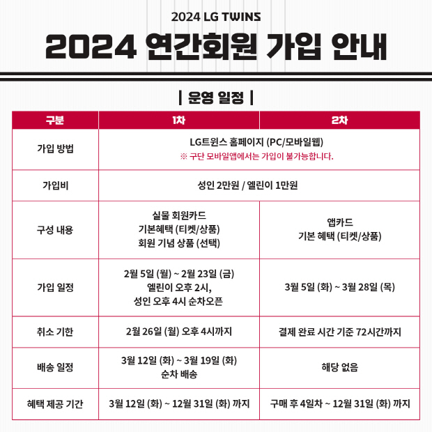 LG트윈스 ‘2024 연간회원’ 가입 일정은 2월 5일(엘린이 오후 2시, 성인 오후 4시)부터 23일까지 1차 모집, 3월 5일부터 28일까지 2차 모집으로 진행된다. 가입비는 성인 2만 원, 엘린이 1만 원이며, LG트윈스 홈페이지와 모바일웹을 통해 가입 가능하다.