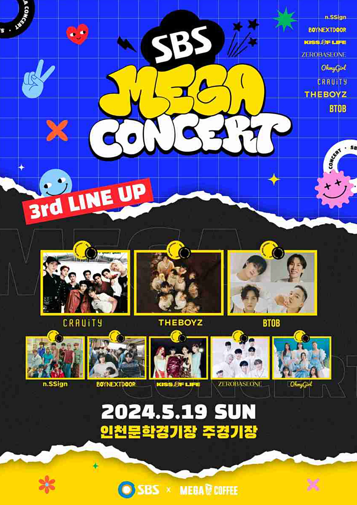 SBS는 5월 19일(일) 인천문학경기장 주경기장에서 개최되는 'SBS MEGA 콘서트'의 3차 라인업을 공개했다. ‘비투비’, ‘더보이즈’, ‘크래비티’ 등 팔색조 매력을 지닌 아티스트들의 가세로 더욱 화려하고 풍성한 무대가 꾸며질 예정이다.